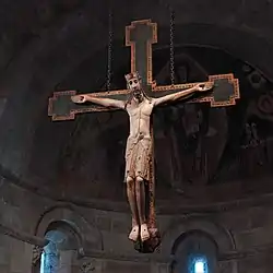 El ábside de Fuentidueña contiene roble blanco, pintura roja, pino y dorado y un crucifijo monumental que cuelga ante él.[10] La cruz es 178 cm de alto y 260 cm de ancho, y se cree que proviene del convento de Santa Clara en Astudillo, cerca de Palencia, en el noroeste de España, aunque los registros no son claros y eso es controvertido.[11] La cruz parece diseñada para colgar sobre un retablo. Su reverso contiene una representación del Agnus Dei ("cordero de Dios"), decorado con follaje rojo y azul en sus marcos.
