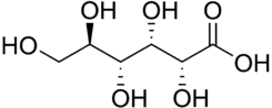 ![]() Estructura química del ácido glucónico, el ácido aldónico derivado de la glucosa. | ||