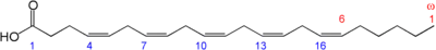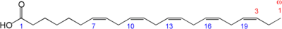 El ácido docosapentaenoico (DPA) designa cualquier ácido graso 22: 5 de cadena lineal, es decir, de cadena abierta, sin ramificar. Es un ácido graso poliinsaturado que contiene 22 carbonos y 5 enlaces dobles. El DPA se utiliza principalmente para designar dos isómeros: el ácido todo-cis-4,7,10,13,16-docosapentaenoico (es decir, 4Z, 7Z, 10Z, 13Z, 16Z-docosapentaenoico) y el ácido todo-cis-7,10,13,16,19-docosapentaenoico (es decir, ácido 7Z, 10Z, 13Z, 16Z, 19Z-docosapentaenoico). También se denominan comúnmente DPA n-6 y DPA n-3, respectivamente; estas designaciones describen la posición del doble enlace siendo 6 o 3 carbonos más cerca del carbono (omega) en el extremo metilo de la molécula y se basa en la diferencia biológicamente importante de que los ácidos grasos poliinsaturados n-6 y n-3 son clases totalmente separadas: los ácidos grasos omega-6 y ácidos grasos omega 3, respectivamente. Los mamíferos, incluidos los humanos, no pueden interconvertir estas dos clases y, por lo tanto, deben obtener ácidos grasos poliinsaturados esenciales de ambas clases en la dieta para mantener la salud normal (consulte los ácidos grasos esenciales).[1][2]