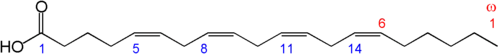 Estos ácidos grasos son isómeros (químicamente idénticos excepto por la posición del doble enlace). Ambos ácidos grasos se podrían llamar ácido eicosatetraenoico, pero solamente se denomina coloquialmente así al primero. |