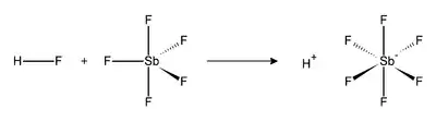 La reacción de fluoruro de hidrógeno (HF) y SbF5 es exotérmica. HF libera el catión (H+), y su base conjugada (F−) es secuestrada por una o más moléculas de SbF5 para producir SbF6− octaédrico. Este anión se clasifica como no coordinante, porque es tanto un nucleófilo débil y una base muy débil. El catión H+ permanece efectivamente "desnudo", lo que trae como consecuencia la extrema acidez del sistema. El ácido fluoroantimónico es 2×1019 veces más fuerte que el ácido sulfúrico. La reacción del fluoruro de hidrógeno y pentafluoruro de antimonio procede como sigue: