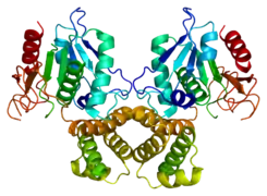 La ácido graso sintasa (FAS) de mamíferos consiste en un homodímero de dos subunidades de proteínas idénticas, en las que se separan tres dominios catalíticos en la sección N-terminal (sintetasa de cetoacetilo (KS), malonil / acetiltransferasa (MAT) y deshidrasa (DH)) por un núcleo Región de 600 residuos de cuatro dominios C-terminal (enoil reductasa (ER), -cetoacil reductasa (KR), acil portador de proteínas (ACP) y la tioesterasa (TE)).[15][16]