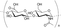 El ácido hialurónico está constituido por cadenas de carbohidratos complejos, en concreto unos 50 000 disacáridos de N-acetilglucosamina y ácido glucurónico por molécula.[6] y deriva de la unión de amino azúcares y ácidos urónicos. Esta cadena se sitúa formando espirales con un peso molecular medio de 2 a 4 millones. Presenta la propiedad de retener grandes cantidades de agua y de adoptar una conformación extendida en disolución, por lo que son útiles a la hora de acojinar o lubricar. Estas propiedades se consiguen gracias al gran número de grupos OH y de cargas negativas de esta molécula, lo que permite, por el establecimiento de fuerzas de repulsión, que se conserven relativamente separadas entre sí las cadenas de carbohidratos.