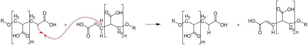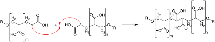 En la siguiente figura, m y n son números naturales que describen el número de eslabones repetidos de ácido acrílico que se han unido en la reacción de elongación a partir de diferentes radicales de inicio. Como esta reacción no se da a una longitud de cadena dada, m y n pueden ser diferentes. El crecimiento de la cadena puede ser terminado por desproporción radical:
