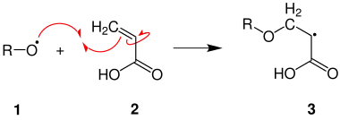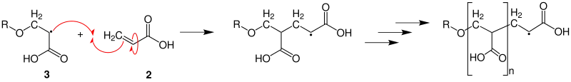 Para empezar la reacción de polimerización el iniciador (1) se escinde en dos radicales libres, reaccionando un par de electrones libres del átomo de oxígeno en el caso del peróxido (R-O en la figura) con el doble enlace C=C del ácido acrílico (2) y genera el radical 3: