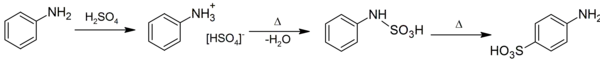 El ácido sulfanílico(Ácido 4-aminobencensulfónico o ácido para-aminobenzeno sulfónico o Ácido anilin-4-sulfónico) C6H7NO3S masa molecular: 173,2 es un sólido cristalino incoloro, inodoro que tiende a tener un aspecto grisáceo debido a la oxidación del aire derivado de la sulfonación de la anilina en su forma ácida. Se prepara calentando anilina con ácido sulfúrico a una temperatura de 190 °C durante varias horas; se forma primeramente sulfato ácido de anilina, después pierde agua con lo que se obtiene la formación del ácido fenilsulfámico que posteriormente se reordena a ácido sulfanílico.