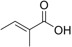 - Esta obra contiene una traducción derivada de «Tiglic acid» de Wikipedia en inglés, publicada por sus editores bajo la Licencia de documentación libre de GNU y la Licencia Creative Commons Atribución-CompartirIgual 3.0 Unported.