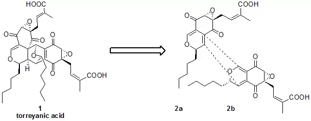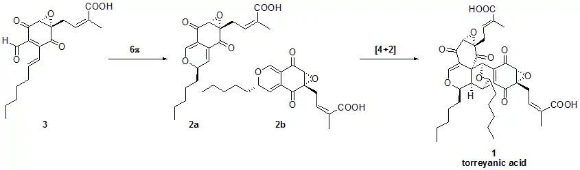 La ruta biosintética propuesta implica tres pasos: (a) Un cierre electrocíclico de anillo de 3, (b) Una oxidación enzimática para proporcionar los diasteroisómeros 2a and 2b, (c) Una ciclodimerización [4+2], para así generar el ácido torreyánico 1.[6]