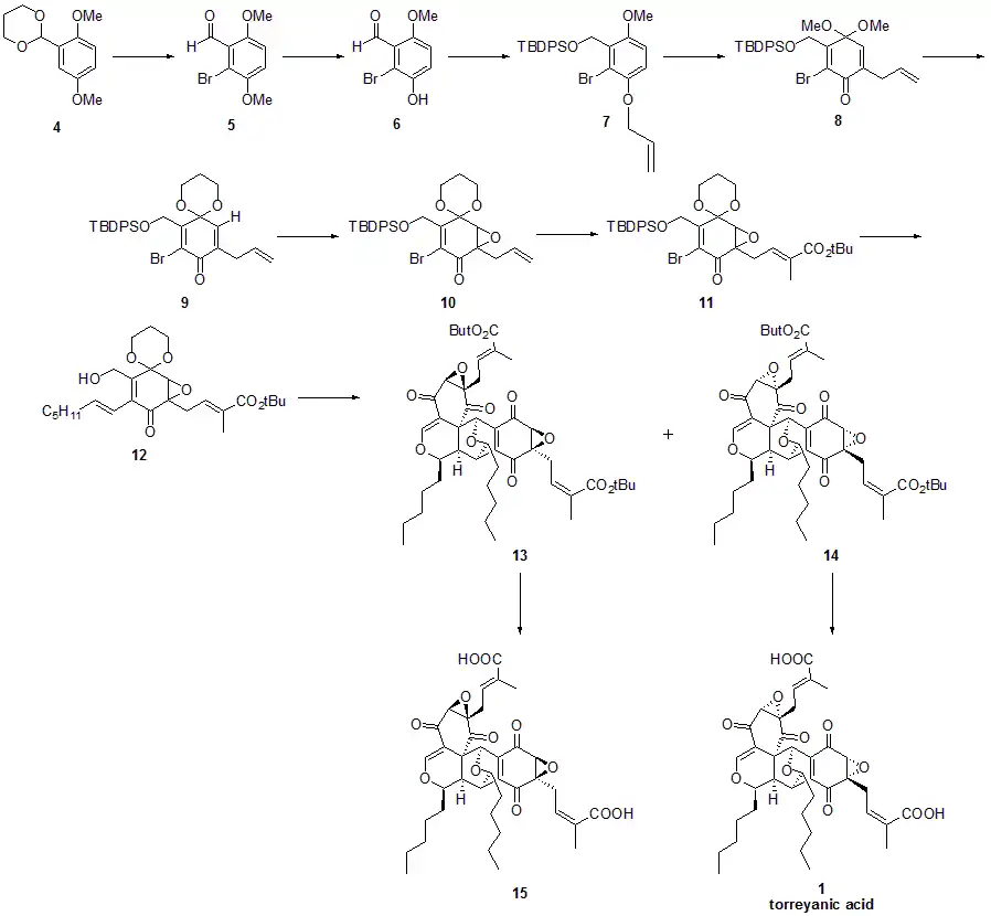 La primera síntesis total del ácido torreyánico fue reportada por Porco y colaboradores en el año 2000[4] Esta síntesis confirmó el argumento propuesto por Lee.[2] Los monómeros fueron preparados por litiación con n-butil litio del intermediario del 1,3-dioxano (4). Posteriormente se sometió el producto a bromación con BrCF2CF2Br y a hidrólisis para obtener el benzaldehído 5. La metilación selectiva de 5 con ácido sulfúrico produce el compuesto aromático 6 con 52% de rendimiento. Al compuesto 6 se le añadió un grupo alilo con bromuro de alilo, se redujo con borhidruro de sodio y se protegió con un grupo sililo para obtener el compuesto 7. El dimetoxiacetal 8 se obtuvo con una transposición de Claisen de 7. El fenol alílico fue sometido a una oxidación con yodo hipervalente, utilizando PhI(OAc)2 en metanol. El producto 8 fue sometido a un intercambio acetálico con 1,3-propanodiol para obtenerse el 1,3-dioxano 9, el cual fue monoepoxidado en condiciones suaves con Ph3COOH, KHMDS, -78 °C a -20 °C por 6 horas para dar el producto 10. Un fragmento de ácido 2-metil-2-butenoico se añadió para dar el compuesto 11, el cual se le agregó un grupo vinilo con una reacción de Stille, utilizándose estannato de (E)-tributil-1-heptenil; subsecuentemente se removió el grupo sililo con TBAF/AcOH y el acetal por hidrólisis para obtenerse el epóxido de la quinona 12. El tratamiento de 12 con el reactivo de Dess-Martin promovió la dimerización y electrociclización para obtenerse 13 and 14. Por tratamiento de 13 y 14 con TFA para remover el ester de ter-butilo se obtuvieron el ácido isotorreyánico 15 y el ácido torreyánico 1 respectivamente.[4]