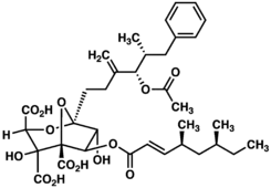 Ácido (1R,2S,3S,5S,6R,7R)-5-[(4S,5R)-4-acetoxi-5-metil-3-metilen-6-fenilhexil]-7-[(E,4S,6S)-4,6-dimetil-1-oxooct-2-enoxi]-2,6-dihidroxi-4,8-dioxabiciclo[3.2.1]octano-1,2,3-tricarboxílico | ||