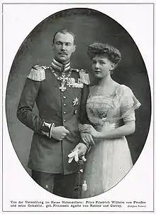 - «POPE AND KAISER.». The Register (Adelaide). LXXV, (19,868) (South Australia). 16 de julio de 1910. p. 14. Consultado el 16 de febrero de 2017 – via National Library of Australia. POPE AND KAISER. A PRINCESS EXCOMMUNICATED. FOR MARRYING A PROTESTANT. BERLIN. July 15. Roman Catholic newspapers in Germany announce that Princess Agatha of Ratibor Hohenlohe-Schillingsfurst, daughter of Duke Victor of Ratibor, has been excommunicated from the Church of Rome for having married Prince Frederick William of Prussia, who is a second cousin of the German Emperor, and son of the late Prince Albrecht, Regent of Brunswick. The Kaiser gave his consent to the betrothal of his cousin last January.