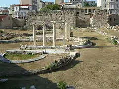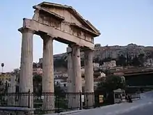 La entrada este al Ágora romana fue construida entre 19 y 11 a. C. Tenía una fila de cuatro columnas jónicas de mármol gris del Himeto.[2] Es uno de los dos propileos (entradas principales) originales que daban acceso al mercado; en una estoa cercana hay esculturas de romanos ilustres, probablemente emperadores o funcionarios.