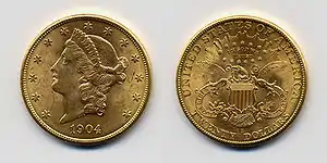 - Liberty Head, con lema escrito que dice "Twenty Dollars" 1877–1907