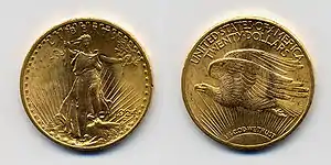 El diseño original mostraba en el anverso una cabeza femenina simbolizando la libertad, rodeada de 13 estrellas, y en el reverso un Escudo de Estados Unidos estilizado; la nueva versión de Saint Gaudens mostraba en el anverso una figura femenina de cuerpo entero simbolizando la libertad mientras portaba una antorcha y una rama de olivo, en el reverso aparecía un águila en pleno vuelo sobre un sol naciente.