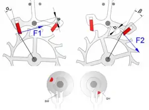 Debajo de la horquilla se sitúa un pasador de protección saliente, que funciona como un rodillo de seguridad, separado del eje de equilibrio. En situación normal no tiene función alguna, pero su propósito es asegurar que la horquilla esté en la posición correcta para recibir el impulso si una sacudida del reloj 'desbloquea' prematuramente la palanca de la rueda de escape.