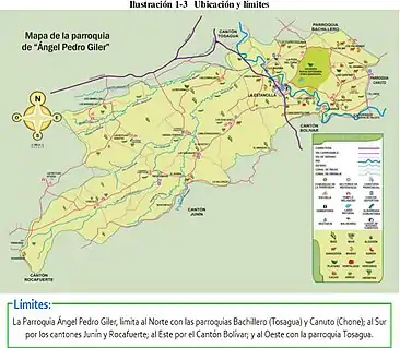 Cuenta con una Plaza Cívica para actos solemnes, tres parques con áreas verdes, un templo parroquial de la Iglesia Católica, coliseo cerrado para eventos deportivos, en el casco parroquial se encuentra una Unidad Educativa Siglo XXI llamada Ángel Pedro Giler, Centro de Atención para adultos mayores, un centro de salud, el edificio del Gobierno Autónomo descentralizado con un Infocentro Comunitario.