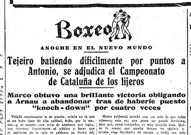 - 19 de mayo de 1927, Antònio: En el Nuevo Mundo se enfrenta a 10 asaltos a Pere Antònio, en combate valedero para el título de Cataluña de peso ligero, que ha quedado vacante al hacerse el catalán Tomás Cola con el título de España. Antonio consigue imponerse en el primer asalto, en el segundo y en el tercero. Pero poco a poco Tejeiro responde con un brioso ataque que lleva a ambos púgiles al castigo a la cara y al flanco en un cerrado cuerpo a cuerpo. Ambos llegan a la campana final muy castigados, y los jueves otorgan el veredicto a Tejeiro, que de esta manera se proclama campeón de Cataluña del peso ligero.[37]
