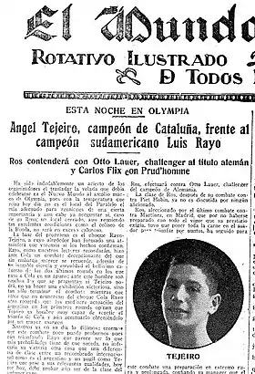 - 14 de abril de 1928, Torres: Concede la revancha a Torres un mes más tarde en el Olimpia de Madrid. En el segundo asalto Torres consigue colocar con precisión la derecha en la mandíbula de Tejeiro, que cae a la lona. Cuando la cuenta llega a cuatro, Tejeiro se incorpora con una rodilla sobre el tapiz, para reponerse mientras el árbitro lleva la cuenta a diez. Sin embargo, el árbitro juzga que Tejeiro no se levanta con la presteza necesaria, por lo que acaba declarándole derrotado por k.o. Mundo Deportivo protesta por lo que parece un claro favoritismo hacia el boxeador “de casa”, por lo que introduce una interrogación en el titular en el que anuncia Tejeiro knocautado (?) por Torres.[52]