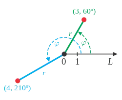 Una rotación en el sentido de las agujas del reloj se considera una rotación negativa, por lo que, por ejemplo, una rotación de 310° (en sentido contrario a las agujas del reloj) también se puede llamar una rotación de –50° (dado que 310° + 50° = 360° es una rotación completa (vuelta)). Una rotación en sentido contrario a las agujas del reloj de más de una vuelta completa se mide normalmente en módulo 360°, lo que significa que se resta 360° tantas veces como sea posible para dejar una medición no negativa de menos de 360°.[5]
