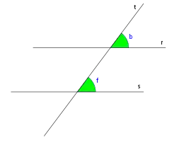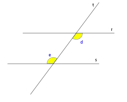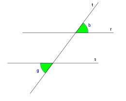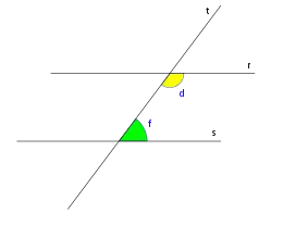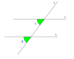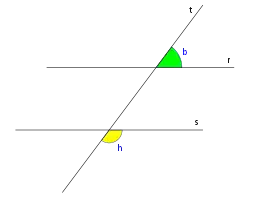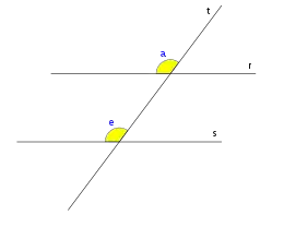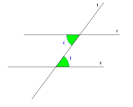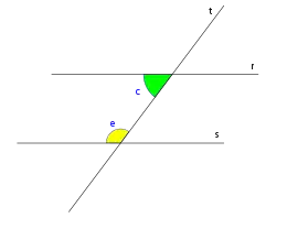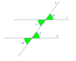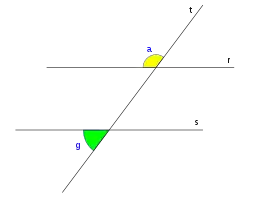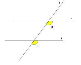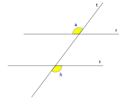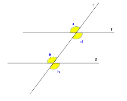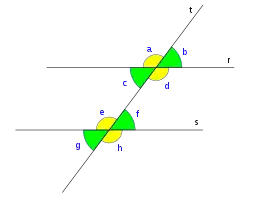 Los ángulos entre rectas paralelas y una secante, en geometría euclidiana, son los ocho ángulos formados por dos rectas paralelas (r y s en la imagen de la derecha) y una transversal a ellas (t).