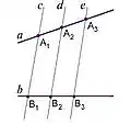 La controversia sobre el V postulado alcanza la definición de los ángulos entre rectas paralelas y una secante desde el momento mismo de la elección de la noción de «rectas paralelas»: las que guardan siempre la misma distancia; las que no se encuentran; o bien las que forman ángulos congruentes al ser cortadas por una transversal.[5]