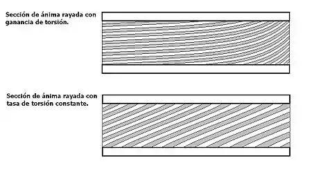 En ocasiones, el cañón puede tener tasas de torsión gradualmente mayores hacia la boca, lo que se conoce como "torsión progresiva", o "ganancia de torsión". Una tasa de torsión decreciente desde la culata a la boca no es práctica, puesto que no consigue estabilizar el proyectil en el viaje a través del cañón.[3][4] Proyectiles excepcionalmente largos, como dardos o flechettes requerirían tasas de torsión demasiado altas como para resultar prácticas. Tales proyectiles deben estar diseñados para ser inherentemente estables, y generalmente se disparan con un cañón de ánima lisa.
