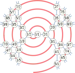 La secuencia de Calkin-Wilf, representada como la espiral roja trazaza a través del árbol de Calkin-Wilf