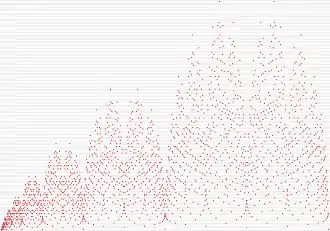 , 0 ≤ 2r < n,[9] y también cuenta el número de formas de escribir n como una suma de powers of two en la que cada potencia aparece como máximo dos veces. Esto se puede ver en el fusc que define la recurrencia: las expresiones como una suma de potencias de dos para un número par 2n no tienen 1 (en cuyo caso se forman duplicando cada término en una expresión para n) o dos 1 (en cuyo caso el resto de la expresión se forma duplicando cada término en una expresión para n − 1), por lo que el número de representaciones es la suma del número de representaciones para n y para n − 1, coincidiendo con la recurrencia. De manera similar, cada representación de un número impar 2n + 1 se forma duplicando una representación de n y sumando 1, igualando nuevamente la recurrencia.[10] Por ejemplo,