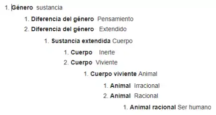 El ejemplo nos muestra cómo el esquema va dividiendo cada género en dos opciones, las cuáles van dirigiéndose a la especie más baja, describiendo al ser humano de esta manera como una sustancia extendida, lo que implica que posee un cuerpo. Este cuerpo está vivo, lo cuál implica que es un animal. Este animal tiene la característica de ser racional.
