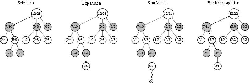 Pasos de ejemplo de una ronda se muestran en la siguiente figura. Cada nodo del árbol almacena el número de ganados/jugados playouts .