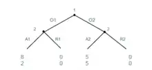 En este árbol de decisión podemos observar como hay cuatro posibles soluciones finales. En él se cumplen las normas antes descritas (nodo inicial, una única flecha por nodo y un único camino para llegar a cada nodo final) y tiene todos los elementos antes descritos (nodos, vectores de números, flechas y etiquetas). La imagen representa un árbol de decisión conformado por dos jugadores, en él se pueden observar las opciones que El juego cuenta con dos jugadoras. La primera decisión la ha de tomar la jugadora 1, quien debe decidir entre O1 y O2, en este punto será la jugadora 2 quien decida. Si la Jugadora 1 ha elegido O1, tendrá que decidir entre A1 y R1, A1 le producirá una utilidad de 2, y R1 de 0, a su vez A1 le reportará una utilidad de 8 a la jugadora 1 y R1 de 0. En cambio, si la jugadora 1 elige O2, la jugadora 2 deberá elegir entre A2 y R2, la primera opción le reportará una utilidad de 5 a ella y a la otra jugadora, R2 reportará una utilidad de 0 a las dos. Con los adecuados métodos de inducción existentes se podría resolver este árbol de decisión sin mucha complicación.