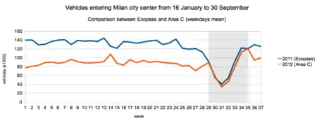 La reducción del tráfico dentro del área restringida del Área C desde su implementación, en comparación con el mismo período del año anterior, fue del 34,3% al 30 de abril de 2012. [20] La reducción total del tráfico en la zona de Milán fue de aproximadamente un 7% Al 30 de septiembre de 2012, la Zona C había estado en funcionamiento durante un total de 140 días (desde el 16 de enero).[21] Durante este período ha habido una disminución del 32,8% en los vehículos que ingresan al área, en comparación con 2011.