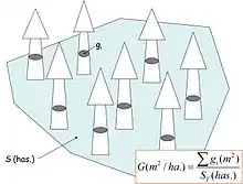 El Área Basimétrica, también denominada Área Basal, y que en terminología dasonómica, se representa por G, es una de las variables de referencia de la masa forestal, cuyos valores son universalmente utilizados en la gestión de su espesura. Este parámetro resulta de expresar en m²/ha, la relación entre las secciones normales de los árboles de un espacio forestal y la superficie de terreno que ocupan. En todos los inventarios forestales, G aparece como una de las informaciones básicas. El procedimiento habitual de su obtención está basado en el muestreo de este parámetro en parcelas circulares de radio fijo. Para su cálculo debemos medir en dichas superficies muestrales, los diámetros normales de todos los pies mayores presentes en ellas, lo que nos permitirá obtener la superficie de sus secciones supuestas circulares, y referir la suma de todas ellas en m²/ha.[1][2]