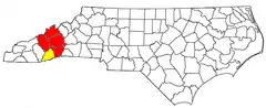 ![]() El área metropolitana combinada de Asheville-Brevard CSA y sus componentes: el área metropolitana de Asheville en rojo y el área micropolitana de Brevard en amarillo. | ||