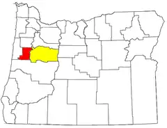 ![]() Mapa de Oregón con el Área Estadística Metropolitana Combinada de Albany-Corvallis-Lebanon (CSA), compuesta por: