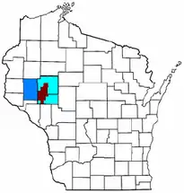 ![]() Mapa de Wisconsin con el Área Estadística Metropolitana Combinada de Eau Claire-Menomonie (CSA), compuesta por el área metropolitana de Eau Claire en celeste y el área micropolitana de Menomonie en azul. | ||