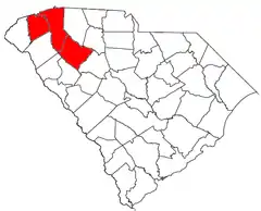 ![]() Mapa de Carolina del Sur con el área metropolitana de Greenville-Mauldin-Easley resaltada en rojo. | ||