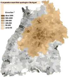 En total, el área metropolitana de Stuttgart se extiende por una superficie de 1334 km² y cuenta con una población de 1,75 millones de habitantes, de los cuales 15,5 y 34% corresponden a la ciudad de Stuttgart, respectivamente. Tiene una densidad de población de 1309 hab/km².