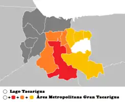 El Área Metropolitana de Valencia o Gran Tacarigua corresponde a todas las entidades, poblaciones y ciudades entorno al Lago de Valencia, siendo conformada por 9 Municipios Autónomos del Estado Carabobo: 5 Municipios de los que integran la Ciudad de Valencia[3] a los cual cuales se les adicional otros 4 Municipios de la entidad carabobeña para formar el Área Metropolitana de Valencia[2] En total suman 23 Parroquias, y acorde a las proyecciones de población OCEI para el 2020 la demografía es: