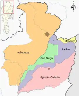 Aunque inicialmente el área metropolitana de Valledupar está integrada por Valledupar, La Paz, San Diego, Manaure y Agustín Codazzi, también podrán ser parte de ésta, los municipios que por el fenómeno de conurbación quieran integrarla, tal como lo establece la Resolución 088 del 7 de abril de 1994.[3]
