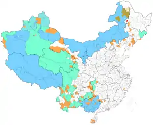 De las cinco regiones autónomas, sólo la región autónoma del Tíbet tiene una mayoría absoluta (> 50%) del grupo étnico designado, a saber, los tibetanos. Xinjiang tiene una mayoría relativa (<50%) del grupo étnico designado, los uigur, aunque esto es discutido por los defensores de la independencia uigur, que afirman que la población china han en Xinjiang se ha visto seriamente sobrestimada. Las tres regiones autónomas restantes tienen mayoría absoluta de chinos de la etnia han, la etnia mayoritaria de China.
