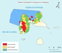 - Archipiélago de Guadalupe, 2334 km2, con 221 km2 de núcleo, una amplia zona colchón y 1328 km2 de superficie marina. Designada por la Unesco en 1992 en el Programa sobre el Hombre y la Biosfera, que pretende mejorar la relación del ser humano con su entorno. En el archipiélago hay 21 comunas y más de 210.000 habitantes. La reserva cubre totalmente la isla de Guadalupe, el Parque nacional de Guadalupe y el macizo volcánico de La Soufrière (1467 m). El núcleo está formado por el macizo forestal de Basse-Terre, los islotes Paloma con los arrecifes coralinos correspondientes, los islotes Kahouanne (20 ha) y Tête à l'Anglais, ambos al norte de Basse-Terre, el centro de la bahía del Grand Cul-de-sac (150 km2), con los manglares y marismas de Choisy y Lambis, el estuario del Grande Rivière à Goyaves, el río costero más importante de Guadalupe, en Basse-Terre, y los islotes de Fajou, Christophe, Carénage y La Biche. Hay una amplia zona de bosque tropical deshabitado al oeste de Basse-Terre, con unas 300 especies de árboles y matorrales. En la costa hay manglares, praderas marinas, esponjas gigantes, corales blandos, tortugas, pelícanos, garzas, patos, etc.[38][39] No se debe confundir con la Reserva de la biosfera de la isla Guadalupe que se encuentra en la Baja California, en el océano Pacífico, en la isla Guadalupe, y pertenece a México.