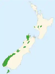 - Tauparikākā, 16 ha, al oeste de la Isla Sur.[11] En la desembocadura del río Ship Creek hasta unos 200 m de la orilla.[12]