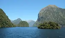En la región de Fiordland, en la esquina sudoccidental de la Isla Sur, dominada por los Alpes del Sur, hay diez reservas marinas.[13] El paisaje en esta zona se caracteriza por los profundos fiordos en toda la costa. Algunas zonas son lo bastante inaccesibles como para que los efectos sobre la caza de ballenas o focas haya sido mínima, en parte debido al clima, muy inestable, con hasta doscientos días de lluvia y precipitaciones que van desde los 1200 mm en Te Anau, hasta los 8.000 mm en Milford Sound, el sitio más conocido por los turistas, en el Parque nacional de Fiordland y Patrimonio de la humanidad de Wahipounamu. El paisaje marino típico es el de profundos acantilados y hábitats protegidos de pared de roca.