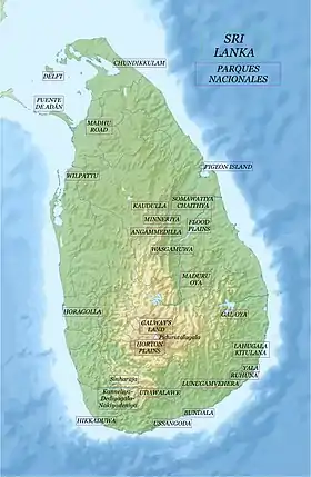 - Parque nacional Bundala, 248 km², centro 62 km², costa sudoeste, lagunas con pantanos.[18]
