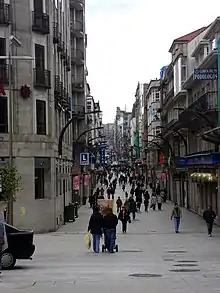 - El Corte Inglés. Inaugurado en 1975, fue el primero construido en Galicia y el primero que la empresa construía en una ciudad no capital de provincia,[50] está ubicado en la Gran Vía y es un gran centro de atracción para clientes de todos los puntos de la ciudad y del área metropolitana.[51] En el interior de estos grandes almacenes también se encuentran instaladas otros establecimientos ajenos al holding comercial de El Corte Inglés, como es el caso de Starbucks,[52] o de la franquicia de comida rápida Rodilla,[53] entre otros establecimientos de moda y restauración.