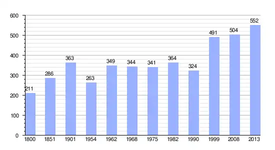 Los datos demográficos contemplados en este gráfico de la comuna de Épisy[5] se han cogido de 1800 a 1999 de la página francesa EHESS/Cassini, y los demás datos de la página del INSEE.[6]