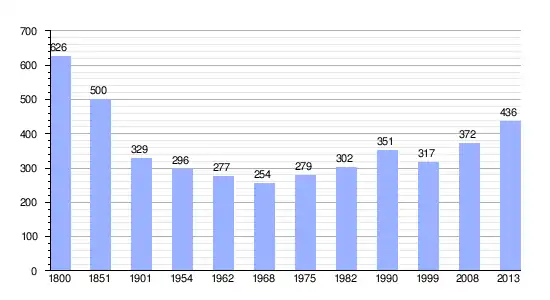 Los datos demográficos contemplados en este gráfico de la comuna de Épreville-en-Roumois[4] se han cogido de 1800 a 1999 de la página francesa EHESS/Cassini, y los demás datos de la página del INSEE.[5]