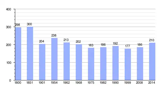Los datos demográficos contemplados en este gráfico de la comuna de Éraville[4] se han cogido de 1800 a 1999 de la página francesa EHESS/Cassini, y los demás datos de la página del INSEE.[5]