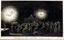 El escenario estaba compuesto por tres partes: En el centro encontrábamos la pantalla de proyección cubierta por una cortina negra que servía como separación entre ambos lados del espectáculo; por un lado, el phantoscopio, y por el otro, unos 15 metros para situar al público.